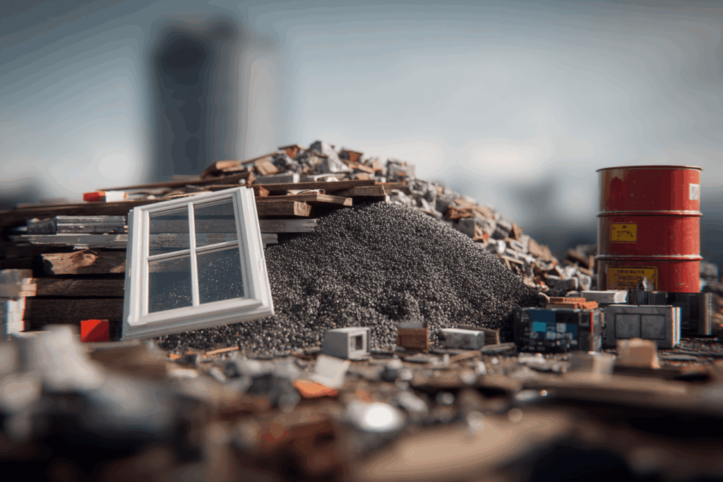 Mineralischer Schutt wie dunkler Boden ohne Gras/Wurzeln, Sand/Kies, Beton, Fliesen, Keramik, Mörtel/Kalk, Estrich. Fremdanteile (Metall/Holz/Plastik/Verpackungen) nur bis max. 5 %.